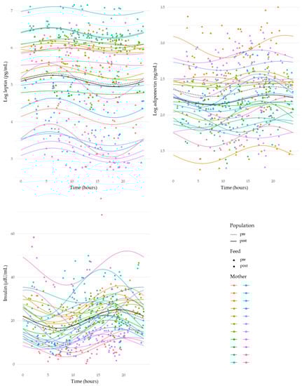 Changes in concentrations of human milk leptin, adiponectin, and insulin over a 24 h period. Average pre-feed sample concentration circadian rhythm is indicated by black dashed line. Average post-feed sample concentration circadian rhythm is indicated by black solid line. Individual mother’s concentrations and rhythms indicated by coloured dots and lines, respectively.