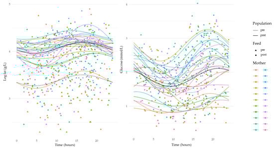 Changes in concentrations of human milk fat and glucose over a 24 h period. Average pre-feed sample concentration circadian rhythm is indicated by black dashed line. Average post-feed sample concentration circadian rhythm is indicated by black solid line. Individual mother’s concentrations and rhythms indicated by coloured dots and lines, respectively.
