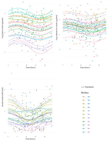 Changes in intakes of human milk leptin, adiponectin, and insulin over a 24 h period. Average circadian rhythm is indicated by black lines. Individual component intakes and rhythms indicated by coloured dots and lines, respectively.