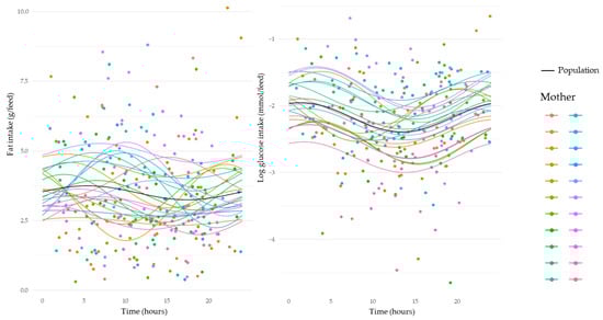 Changes in intakes of human milk fat and glucose over a 24 h period. Average circadian rhythm is indicated by black lines. Individual component intakes and rhythms indicated by coloured dots and lines, respectively.