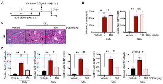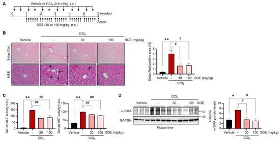 Animal experiments were performed following guidelines of the Institutional Animal Care and Use Committee at Jeonbuk National University. Seven-week-old male C57BL/6 mice were obtained from Samtako (Osan, Republic of Korea) and then accommodated in cages under standard conditions (20 ± 2 °C, 50–60% humidity, 12 h light–dark cycle). For the liver fibrosis model, the mice were injected intraperitoneally (i.p.) with vehicle (mineral oil) or carbon tetrachloride (CCl4) (0.6 mL/kg) twice a week for a total of six weeks. Starting from the second week, the CCl4-treated mice were divided randomly into three groups and were treated with vehicle (phosphate-buffered saline, PBS) or SGE (30 or 100 mg/kg) via oral gavage for the last five weeks. For the acute liver injury model, mice were orally administered SGE (100 mg/kg) four times every 24 h. One hour after the last SGE administration, the mice were subjected to a single injection of CCl4 (0.6 mL/kg, i.p.) and were sacrificed after 24 h.