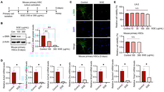 Given the critical role of HSC activation in the development and progression of liver fibrosis [4,11], we next explored whether the beneficial effect of SGE on liver fibrogenesis is indeed attributed to the inhibition of HSC activation. Primary HSCs isolated from mouse liver were treated with SGE at concentrations of 100 or 300 μg/mL during the culture activation for 5 days (Figure 3A). SGE treatment significantly and progressively reduced the expression levels of α-SMA in activated mouse primary HSCs (Figure 3B), which was further confirmed by immunofluorescence staining (Figure 3C). Moreover, SGE treatment suppressed the mRNA levels of fibrogenic genes in the HSCs (Figure 3D). Notably, the inhibition of fibrogenic gene expression in HSCs was not due to the cytotoxicity of SGE (Figure 3E).