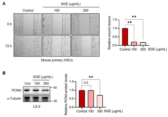 The effects of SGE on the migration and proliferation of HSCs. (A) Migration assay in mouse primary HSCs. The cells were treated with SGE (100 or 300 μg/mL) for 72 h. The relative wound closure was quantified (n = 3). (B) Immunoblotting for PCNA in LX-2 cells (left). The cells were treated with SGE for 24 h. The relative protein levels of PCNA were quantified and normalized to those of α-Tubulin (right) (n = 3). The data are presented as mean ± SEM. The statistical significance of the differences between the groups was determined as follows: ** p < 0.01 compared with the control group. N.S., not significant.