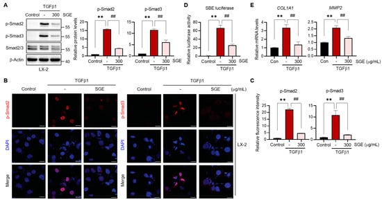 TGFβ1 is known as the most potent fibrogenic mediator that promotes HSC activation [12]. To elucidate the underlying mechanism by which SGE inhibits HSC activation and liver fibrosis, we examined its effect on TGFβ1 signaling. Treatment of LX-2 cells, a well-established human HSC line, with TGFβ1 resulted in the increased phosphorylation of Smad2 and Smad3, which are canonical downstream components of the TGFβ1 pathway. However, the TGFβ1-induced phosphorylation of Smad2/3 was significantly blocked by SGE treatment (Figure 5A). When Smad2/3 is phosphorylated, it associates with Smad4 to form a complex that relocates to the nucleus, where it prompts the expression of fibrotic genes [13]. Immunofluorescence staining results demonstrated that SGE treatment significantly reduced the nuclear accumulation of p-Smad2 and p-Smad3 induced by TGFβ1 in LX-2 cells (Figure 5B,C). To strengthen the effect of SGE on the TGFβ1-mediated Smad2/3 signaling pathway, we also performed a luciferase reporter assay. In this system, the luciferase expression was controlled by the Smad binding element (SBE). As expected, TGFβ1 efficiently increased the SBE-driven luciferase activities, which were notably suppressed by SGE treatment in LX-2 cells (Figure 5D), providing compelling evidence for the direct regulatory impact of SGE on the Smad2/3 signaling. As a result, the transcript levels of downstream fibrogenic genes (i.e., COL1A1 and matrix metalloproteinase-2 (MMP2)) that were induced by TGFβ1 exhibited efficient attenuation upon supplementation with SGE (Figure 5E). Furthermore, we examined the effects of SGE on non-canonical TGFβ1 pathways and observed that JNK and ERK signaling pathways downstream of TGFβ1 remained unaffected by SGE treatment in LX-2 cells (Figure S3). Overall, these findings support the notion that SGE treatment inhibits HSC activation mainly by blocking TGFβ1-Smad2/3 signaling.