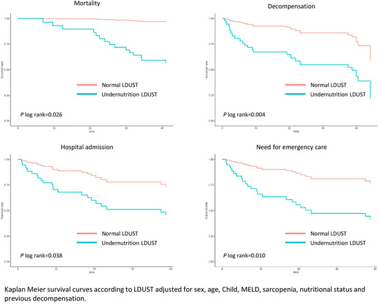 The survival analysis was adjusted for sex, age, comorbidity, presence of previous decompensation, sarcopenia, malnutrition according to GLIM criteria, and liver function of the patients. Compared to well-nourished patients, those affected with undernutrition according to LDUST had an increased risk of mortality (HR 14.72 (95% CI 1.93–112.13), p = 0.001), decompensation (HR 10.16 (95% CI 3.02–34.17), p = 0.001), admission (HR 9.39 (95% CI 2.77–31.87), p = 0.007), and emergency care (HR 9.93 (95% CI 2.94–33.54), p = 0.009) during follow-up. These analyses are shown in Figure 2.