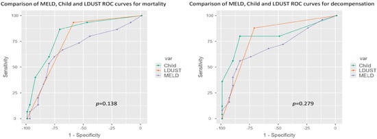 In both cases, no significant differences were observed between the area under the ROC curve (AUC-ROC) of the three tools for either death (LDUST 0.764, MELD 0.683, Child 0.819, p = 0.138) or occurrence of decompensation (LDUST 0.799, MELD 0.700, Child 0.811, p = 0.279) (Figure 3).