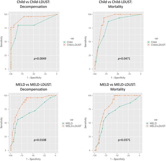 ROC analyses of these variables were then made and compared with the ROC curve of the original ones. Compared to the original Child and MELD scores, their combination with LDUST improved the AUC to predict decompensation (0.936 Child-LDUST vs. 0.811 Child; (p = 0.005)) and (0.904 MELD-LDUST vs. 0.819 MELD; (p = 0.011)), and mortality (0.866 LDUST-Child vs. 0.700 Child; (p = 0.047)) and (0.824 MELD-LDUST vs. 0.683 MELD; (p = 0.037)).The differences were statistically significant in both cases (Figure 4).
