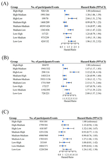 During the 80,860 person-years of follow-up (with a median follow-up time of 5.5 years), 3023 incident CF cases were recorded. The incidence of CF was lowest in the high-to-high group (23.9 per 1000 person-years), while it was greatest in the high-to-low group (71.4 per 1000 person-years). Compared with participants in the high-to-high group, a significantly increased risk of CF was observed in participants in the groups with a decrease in DDS. Specifically, regarding overall DDS, the adjusted HRs (95%CI) of developing CF were 1.30 (1.06, 1.59) for the high-to-medium group, 2.04 (1.51, 2.74) for the high-to-low group, and 1.81 (1.47, 2.22) for the medium-to-low group. Lower overall DDS patterns also increased CF risk with HRs of 1.49 (1.19, 1.86) for the low-to-medium group and 1.96 (1.53, 2.52) for the low-to-low group (Figure 1A).