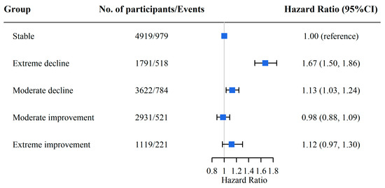 We regarded a DDS that remained stable as a reference and found that a declining DDS was associated with a higher risk of CF. Specifically, the HRs (95% CI) were 1.67 (1.50, 1.86) for the extreme decline group and 1.13 (1.03, 1.24) for the moderate decline group, whereas the moderate and extreme improvement groups did not have a significantly increased risk of CF (p > 0.05) (Figure 2). Similar relationships were observed between plant-based or animal-based absolute DDS change patterns and CF (Table S4) and in the subgroup analyses (Table S5).