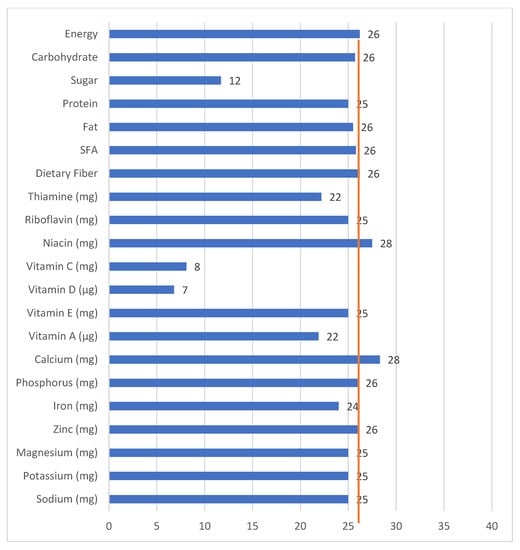 The energy intake of breakfast among adult Indonesians (396 Kcal) corresponded to 26% of daily energy intake. The energy contribution of breakfast to daily intake is similar to the results in Malaysia (26%) [] and the Philippines (30%) [] but higher compared with America (21.6–23%) and Europe (16–24%) [,,,,]. The contributions of other macro- and micronutrients are similarly at the level of 21–25%, except for vitamin C (8,%), vitamin D (7%) and total sugar (12%). The low vitamin C intake is likely due to the low percent of consumers of vegetables (35%) and fruit at breakfast (3%).