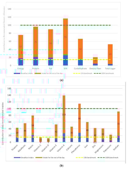 Figure 3a,b shows the adequacy of macro- and micronutrient intake against the RDA (marked by green dashed line 100% benchmark) and how much breakfast intake contributed to the RDA. The yellow dashed line shows the 15% benchmark, which was the minimal nutrient contribution expected from breakfast according to the Indonesian Dietary Guidelines []. The daily adequacies of median energy and carbohydrate intake were 78% and 66%, respectively, and breakfast contributed 18% and 16% toward the RDAs, respectively. The daily adequacies of protein and total fat reached 98% and 90%, respectively, and the contribution of breakfast intake was around 20%. Daily intakes of saturated fatty acids exceeded the RDA, with breakfast contributing 26%. Daily intakes of dietary fiber reached only 21% of the RDA, with breakfast contributing to only 5%. Total sugar intake from this study was 53% of the recommended allowance of less than 50 g per day, and breakfast contributed only to 4% of this recommendation. Among all micronutrients in Figure 3b, only vitamin A and phosphorus intakes reached the RDA, while sodium intake was close to the maximum recommendation. The lowest daily adequacy of micronutrient intake was found for vitamin D (12%), vitamin C (14%) and potassium (22%). Breakfast contributed to more than 20% of the RDA for niacin, vitamin A and phosphorus, while all other micronutrient intakes during breakfast were less than 15% of the RDA.