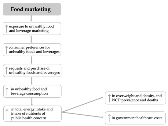 Impact of food marketing to children; Adapted from UNICEF, 2021 [11]. Arrows pointing up (↑) represent an increase.