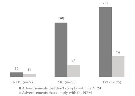 Number of food and beverage TV advertisements according to compliance with the Portuguese NPM (p = 0.020).