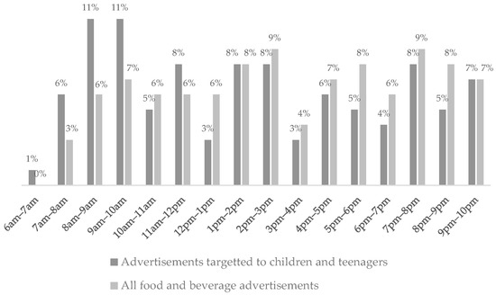 Regarding advertisement time slots, most of the advertisements occurred between 2 pm–3 pm (9%) and 7 pm–8 pm (9%), and most of the advertisements targeting children and teenagers occurred between 8 am–9 am (11%) and 9 am–10 am (11%) (Figure 3).
