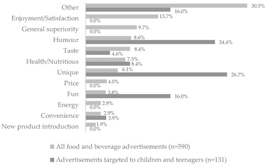 Among primary persuasive techniques, the “other” category was the most frequently used in all food and beverage advertisements (n = 180, 30.5%). This category stood out when the advertisements focused on sustainability matters and environmental protection, vegetable protein choices, and fair-trade labels. “enjoyment/satisfaction” (n = 81, 13.7%) and “general superiority” (n = 57, 9.7%) were the second and third most used primary persuasive techniques. Considering food and beverage advertisements targeted to a young public, “unique” was the most used primary persuasive technique (n = 35, 26.7%), followed by “humour” (n = 32, 24.4%) and “fun” (n = 21, 16.0%) and “other” (n = 21, 16.0%) (Figure 4).