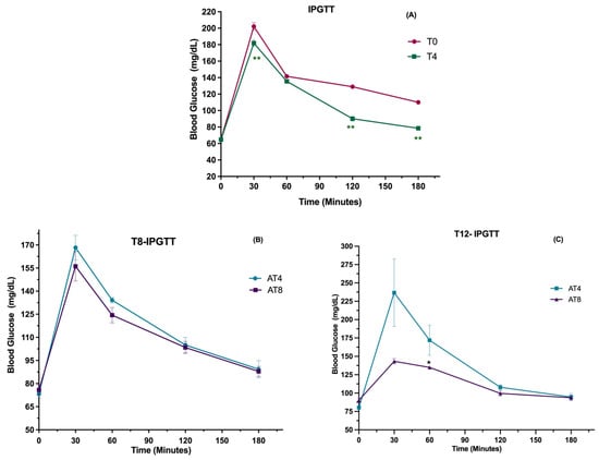 Intraperitoneal glucose tolerance test (IPGTT). (A) A paired t-test was performed to analyze the IPGTT at time points T0 and T4. (B) An independent t-test was performed to analyze the difference between AT4 and AT8 at T8. (C) An independent t-test was performed to analyze the difference between AT4 and AT8 at T12. Data are shown as Mean ± S.D. Statistical significance was set at p ≤ 0.05. Statistically significant * (p ≤ 0.05) and ** (p ≤ 0.01).
