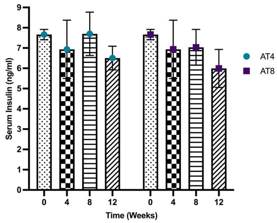 After 4 weeks of moderate-intense training, the serum insulin level decreased from 7.66 ± 0.26 ng/mL to 6.93 ±1.44 ng/mL (Figure 4). In AT4, the serum insulin level increased to 7.67 ± 1.07 ng/mL after 4 weeks of detraining at T8, then decreased again at T12, but it was not significant. In AT8, the insulin level (7.03 ± 0.88 ng/mL) at T8 remained similar to T4. However, after 4 weeks of detraining, at T12, the insulin level was lowered (5.99 ± 0.94 ng/mL). Compared to AT4, the serum insulin level was lower in the AT8 group at T8 and T12, but this did not reach statistical significance.