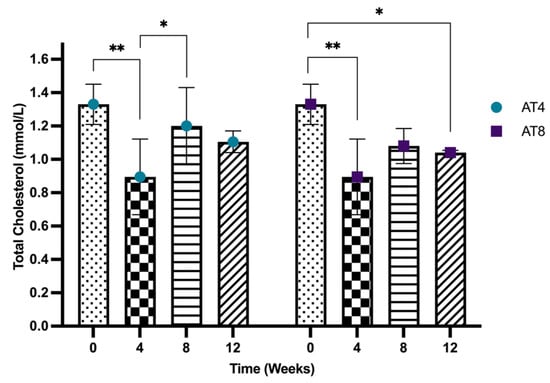 The serum total cholesterol concentration reduced significantly from 1.33 mmol/L, 95% CI at baseline, to 0.89 mmol/L, 95% CI after 4 weeks of training (p < 10−4)). In AT4, the cholesterol level significantly increased at T8 (1.20 mmol/L, 95% CI) after 4 weeks of detraining compared to T4 (p = 0.023), and no further significant change was observed at T12, while in AT8, even after 4 weeks of detraining, the serum cholesterol level at T12 (1.04 mmol, 95% CI) remained significantly lower than the level at T0 (p = 0.004). Cholesterol levels remained lower in the AT8 group at T8 and T12 compared to AT4, but there was no significant difference among the groups (Figure 5).