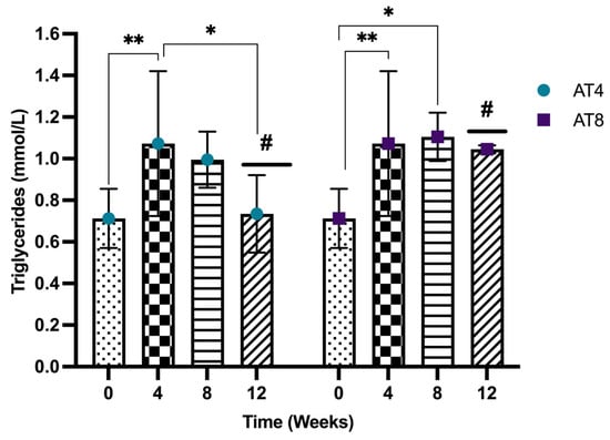 The serum triglyceride concentration significantly increased from 0.71 ± 0.14 mmol/L at baseline to 1.07 ± 0.35 mmol/L after 4 weeks of training (p = 0.009). In AT4, after training cessation, the triglyceride level started to decrease to reach 0.99 ± 0.13 mmol/L at T8, then 0.73 ± 0.17 mmol/L at T12, which is significantly lower than the value at T4 value but still similar to the baseline level. In contrast, in AT8, triglyceride levels increased significantly to 1.10 ± 0.12 mmol/L (p = 0.021) at T8 compared to baseline, and a slight reduction after training cessation of 0.96 ± 0.02 mmol/L was observed at T12. Moreover, at T12, in AT4, the serum triglycerides level was significantly lower than AT8 (p = 0.011) (Figure 6).