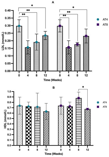Serum low-density lipoprotein (LDL) and high-density lipoprotein (HDL) concentration. (A) LDL Comparison between time points and between groups. (B) HDL comparison between groups for each time point and between groups. ANOVA with multiple comparisons was performed, and statistical significance was set at p ≤ 0.05. Statistically significant difference among time points * (p ≤ 0.05) and ** (p ≤ 0.01).