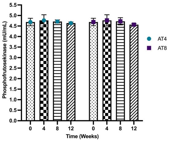 Phosphofructokinases (PFK) were assessed in the gastrocnemius muscle of rats. The PFK level was 4.69 ± 0.17 mU/mL at baseline and 4.77 ± 0.27 mU/mL at T4. The PFK level was maintained in AT4 and AT8 at all time points. No significant change was observed between different time points or between groups (Figure 9).