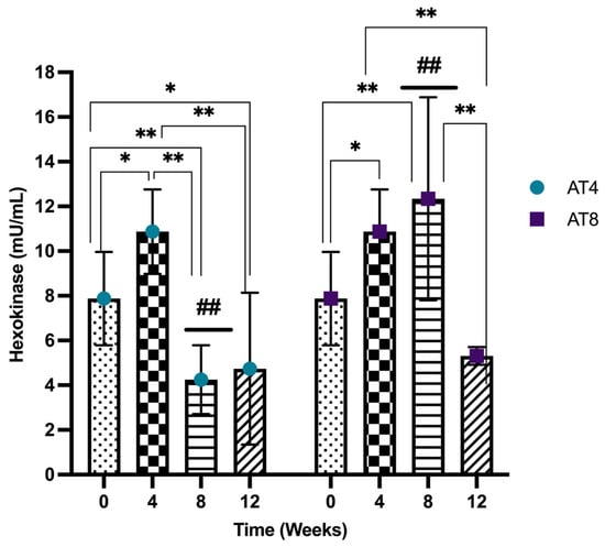 Hexokinase (HK) activity was assessed in the gastrocnemius muscle of rats, and it increased significantly after 4 weeks of training from 7.87 ± 2.09 mU/mL at T0 and 10.87 ± 1.89 mU/mL at T4 (p ≤ 0.05). However, in AT4, after 4 weeks of detraining, HK decreased at T8 (4.25 ± 1.54 mU/mL) and was significantly lower than baseline and T4 values (p < 10−4). No further change was observed at T12 compared to T8. In AT8, the HK continued to increase with 8 weeks of training (12.34 ± 4.54 mU/mL compared to baseline, p = 0.004). Then, it decreased drastically to 5.31 ± 0.39 mU/mL at T12 after 4 weeks of detraining (p < 10−4). At T8, there was a significant (p < 10−4) difference observed among AT4 (4 weeks of detraining) and AT8 (continuous training for 8 weeks) (Figure 10).
