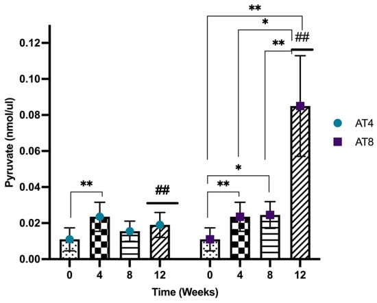 Pyruvate was assessed in the gastrocnemius muscle of rats, and it increased significantly after 4 weeks of training from 0.01 nmol/uL, 95%CI at baseline and 0.02 nmol/uL, 95% CI at T4 (p = 0.002). In AT4, the pyruvate level was then maintained at a similar level at T8 and T12 after training cessation. In AT8, the pyruvate level was maintained at T8 (p = 0.02) but increased significantly to 0.08 nmol/uL, 95% CI, p < 10−4 at T12 after 4 weeks of training cessation compared to baseline, T4 and T8 (p ≤ 0.01). A significant difference between AT4 and AT8 was observed at T12 (p = 0.042) (Figure 11).