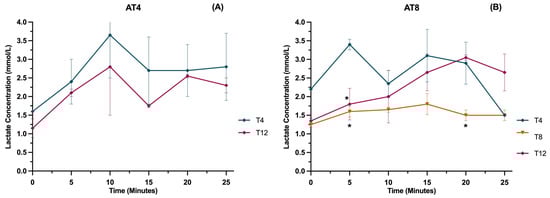 Glycogen increased significantly after 4 weeks of training from baseline (0.04 ± 0.00 ug/uL) to T4 (0.06 ± 0.01 ug/uL) (p < 10−4). Then, the glycogen concentration decreased significantly in both groups (AT4 and AT8) at T8 (p ≤ 0.01). In AT4, no further decrease was observed at T12, but the level remained lower than T4 (p = 0.002). In AT8, the glycogen level tended to increase at T12 after 4 weeks of training cessation and was higher than the baseline level (p = 0.004). At T12, the glycogen level was higher in AT8 compared to AT4 (p = 0.16) (Figure 12).