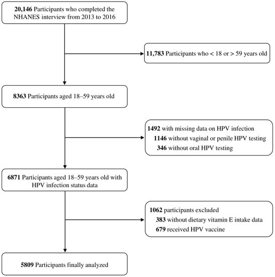 A total of 20,146 participants completed the NHANES interview from 2013 to 2016, of whom 11,783 participants were under 18 or over 59 years old. We excluded 1146 participants with missing data on genital HPV testing, 346 participants with missing data on oral HPV testing, 383 participants with missing data on dietary vitamin E intake, and 679 participants with any dose of HPV vaccine. Ultimately, this study included 5809 participants in total. The details of the inclusion and exclusion procedure are presented in Figure 1. In Supplementary Table S1, the baseline characteristics of the included and excluded subjects are displayed.