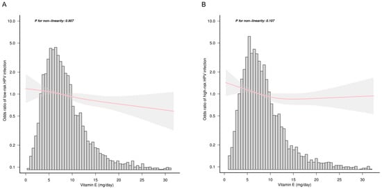 Association of dietary vitamin E intake with (A) overall low-risk and (B) high-risk HPV infection. The solid pink lines and dotted pink lines represent the predicted odds ratios and 95% confidence intervals, respectively. All covariates presented in Table 2 were adjusted. Only the top 99% of dietary vitamin E intake data were shown.