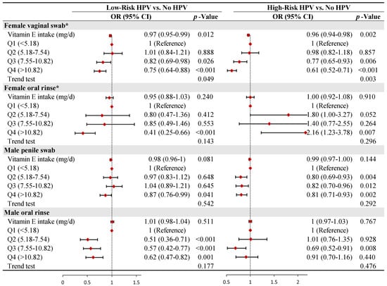 In order to examine the differences in gender and site of the relationship between vitamin E consumption and HPV infection status, stratified analysis was performed, including samples from female vaginal swabs, female oral rinses, male penile swabs, and male oral rinses.