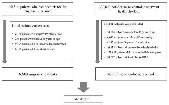 The eligibility criteria for migraine patients included age between 20 and 80 years, a diagnosis of migraine confirmed by board-certified neurologists, a reference to the International Classification of Diseases, 10th revision (ICD-10) code G43 in their medical records, and a history of at least two outpatient visits or a single admission to the neurology department. The control group consisted of individuals aged 20 to 80 years who underwent general health screenings at a health promotion center. Those with a prior history of headaches or migraines were identified through a basic pre-checkup questionnaire. Individuals visiting our medical center explicitly for headache or migraine treatment were excluded. The Clinical Research Ethics Committee of Chuncheon Sacred Heart Hospital, Hallym University, granted approval for the study protocol (IRB no. 2023-07-013). Given that the study employed only de-identified data, the review board waived the need for informed consent.