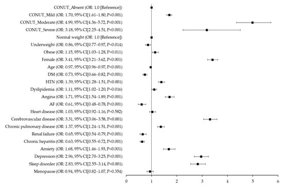 Multivariate analyses were performed to explore the connection between malnutrition, in terms of the nutritional indices (CONUT and PNI), and migraine. Odds ratios (ORs) and their 95% confidence intervals (CIs) were calculated using logistic regression. These ORs indicate the risk of malnutrition in relation to exposure compared to the risk without exposure. Fully adjusted ORs for both CONUT and PNI were determined for each factor, including migraine. The ORs were adjusted for all variables, as well as for those selected through backward elimination.