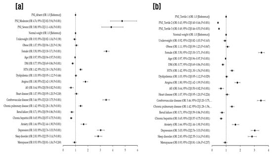 Figure 2 provides the fully adjusted odds ratios (aORs) for migraine occurrence, as derived from a multivariate analysis incorporating all clinical factors and CONUT scores (Figure 2). Correspondingly, Figure 3 delineates the aORs for migraine onset based on a multivariate analysis that integrated all clinical parameters and PNI scores. In this study, PNI scores are presented categorically, considering both the traditional scoring method and the tertile divisions (Figure 3).