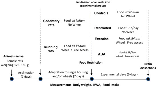 Figure 1 show a schematic representation of the experimental design. Apparatus and procedure were the same as previously described [17,18]. In summary, after 1 week of ac-climatization, rats were housed singly and randomly divided into: sedentary rats (n = 16 rats per group, housed in standard polycarbonate cages) and running rats (n = 16 rats per group, housed in polycarbonate cages equipped with running wheels (Ugo Basile Activity wheel, Ugo Basile, Varese, Italy)). Animals were adapted to their housing conditions for 7 days with ad libitum food and running wheel access (where applicable). Every day, 30 min before the shift to the dark cycle, body weight, 24 h food intake and RWA were monitored. At the end of the adaptation phase, rats from each group (sedentary and running rats) were randomly separated into two cohorts of animals (n = 8 rats per group) according to their protocol conditions: (1) ‘Control’: sedentary + 24 h/food access; (2) ‘Restricted’: sedentary + 1.5 h/food access; (3) ‘Exercise’: activity wheel + 24 h/food access; (4) ‘ABA’: activity wheel + 1.5 h/food access. 1.5 h after the start of the 12 h dark cycle, food was completely removed from the cages of ABA and Restricted groups. Throughout the food restriction period (6 days) a pre-weighed amount of food was provided for 1.5 h each day, at the beginning of the dark phase. At the end of this free feeding period, remaining food was removed and weighted to measure food consumption. During the remaining 22.5 h, ABA group had free access to the wheel. Exercise and Control groups continued to have food ad libitum, and Exercise rats had free access to the wheel. 30 min before the shift to the dark cycle, daily body weight, 24 h food intake (Control and Exercise groups) and RWA (Exercise and ABA groups) were monitored.