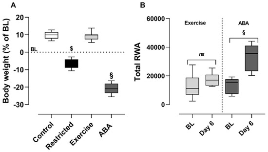 (A) Body weight and (B) RWA in the Control, Exercise, Restricted, and ABA groups at the end of the ABA induction (day 6): Results are presented as the mean ± SEM (n = 8 rats per group). Body weight: statistical analysis was performed by one-way ANOVA, followed by Bonferroni’s post hoc test, § p < 0.001 ABA vs. Control, Exercise, and Restricted; $ p < 0.001 Restricted vs. Control, and Exercise; RWA: statistical analysis was performed by a paired Student’s t-test; ABA § p < 0.001 BL vs. Day 6.