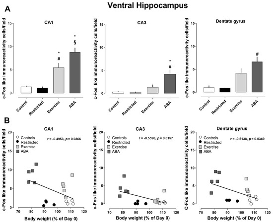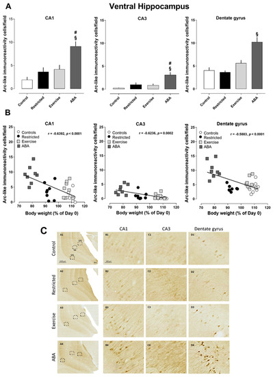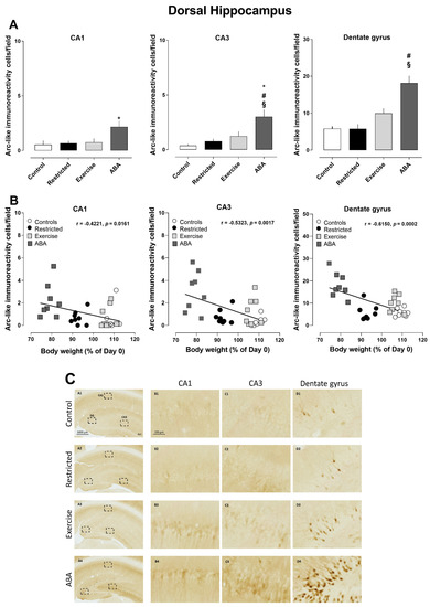 Expression of c-Fos in the ventral hippocampus, and its correlation with body weight (%): (A) Stacked bar charts show the counts of c-Fos-positive nuclei/field in the CA1, CA3, and dentate gyrus subfields of Control, Restricted, Exercise, and ABA rats. Values are expressed as the mean ± SEM of positive nuclei/field (one-way ANOVA followed by Tukey’s post hoc test). CA1: * p < 0.05 ABA vs. Exercise and § p < 0.0001 ABA vs. Control and Restricted, * p < 0.05 Exercise vs. Control and # p < 0.001 vs. Restricted; CA3: * p < 0.05 ABA vs. Exercise and # p < 0.001 ABA vs. Control and Restricted; dentate gyrus: # p < 0.001 ABA vs. Control and Restricted. (B) Correlation between Arc expression and body weight in Control, Restricted, Exercise, and ABA rats.