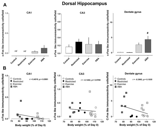 Expression of c-Fos in the dorsal hippocampus, and its correlation with body weight (%): (A) Stacked bar charts show the counts of c-Fos-positive nuclei/field in the CA1, CA3, and dentate gyrus subfields of Control, Restricted, Exercise, and ABA rats. Values are expressed as the mean ± SEM of positive nuclei/field (one-way ANOVA followed by Tukey’s post hoc test). CA3: # p < 0.01 ABA vs. Control and Restricted. (B) Correlation between Arc expression and body weight in Control, Restricted, Exercise, and ABA rats.