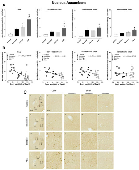Expression of c-Fos in the nucleus accumbens, and its correlation with body weight (%): (A) Stacked bar charts show the counts of c-Fos-positive nuclei/field in the core and the dorsomedial, ventromedial, and ventrolateral shells of the nucleus accumbens. Values are the mean ± SEM of positive nuclei/field (one-way ANOVA followed by Tukey’s post hoc test). Core: § p < 0.001 ABA vs. Control, Restricted, and Exercise; dorsomedial and ventromedial shells: * p < 0.05 ABA vs. Control and Restricted. (B) Correlation between Arc expression and body weight in Control, Restricted, Exercise, and ABA rats.