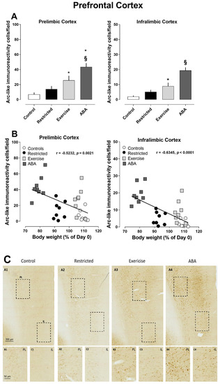 Arc expression in the prefrontal cortex, and its correlation with body weight (%): (A) Stacked bar charts show the counts of Arc-positive nuclei/field in the prefrontal cortex. Values represent the mean ± SEM of positive nuclei/field and (one-way ANOVA followed by Tukey’s post hoc test). Prelimbic Cortex: * p < 0.05 ABA vs Exercise, § p < 0.0001 ABA vs Control and Restricted; * p < 0.05 Exercise vs Control. Infralimbic Cortex: § p < 0.0001 ABA vs Control, Restricted and Exercise; * p < 0.05 Exercise vs Control. Correlation between (B) Correlation between Arc expression and body weight in Control, Restricted, Exercise, and ABA rats. (C) Representative images of Arc-like immunoreactive elements in the prefrontal cortex. (A1–A4) Row A shows the regional distribution of Arc-like immunoreactive elements in representative prefrontal cortices of (A1) Control, (A2) Restricted, (A3) Exercise, and (A4) ABA rats. Columns B and C and show higher magnifications of Arc immunoreactivity in the (B) prelimbic cortex and (C) infralimbic cortex in the regions of interest (rectangles) represented in column A. Scale bars: 300 µm; 50 µm.