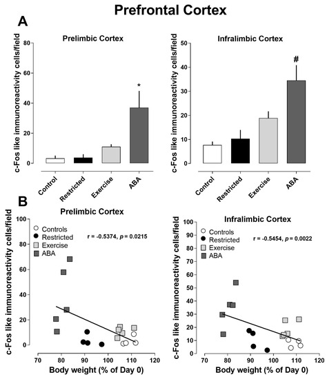 Expression of c-Fos in the prefrontal cortex, and its correlation with body weight (%): (A) Stacked bar charts show the counts of c-Fos-positive nuclei/field in the prefrontal cortex. Values represent the mean ± SEM of positive nuclei/field (one-way ANOVA followed by Tukey’s post hoc test). Prelimbic cortex: * p < 0.05 vs. Control, Restricted, and Exercise; infralimbic cortex: # p < 0.01 vs. Control and Restricted. (B) Correlation between c-Fos and body weight in Control, Restricted, Exercise, and ABA rats.