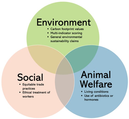 This review looks at sustainability from the perspective of environmental (e.g., carbon footprint, biodiversity loss), social (e.g., fair trade, equal treatment of all workers), and animal welfare (e.g., living conditions, use of antibiotics or hormones) objectives (see Figure 1) []. Different types of labelling can encompass one or more sustainability dimensions and different aspects of food production (e.g., Fairtrade focuses on social sustainability but also has some environmental objectives; the EU organic label covers environmental and animal welfare standards) []. Each of the three sustainability objectives also overlaps with the broad concept of health. The link between health and environmental sustainability reflects the holistic relationship between humans and their natural surroundings. Climate change, in particular, can have direct health impacts. For example, extreme weather events can lead to a rise in infectious diseases, as well as respiratory and cardiovascular outcomes []. Social sustainability indirectly supports individual health by safeguarding fair socio-economic conditions for workers and promoting ethical trade practices. Animal welfare labelling relates to the respect for animal lives and is linked to human health through, for example, preventing the spread of zoonotic diseases and reducing the risk of foodborne illnesses. While there is a clear connection to human health, this review specifically focuses on the three dimensions of sustainability labelling, excluding any research on health-only aspects such as nutrition labelling, which has been covered extensively elsewhere [,].