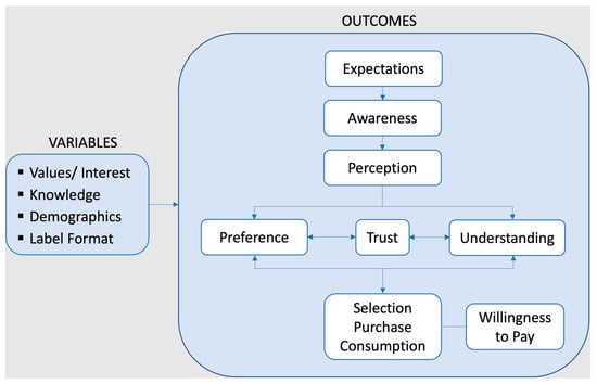 To organize the results of the review, Figure 2 proposes a framework covering variables and outcomes related to consumer attitudes and behaviour relevant to sustainability labelling. The framework is adapted from Grunert and Wills (2007), who drew on theories of consumer decision making and attitude formation and change []. Consumer decision-making research is core to the study of sustainability labelling as it speaks to how choices are made among competing products and the role that information plays. However, consumer decisions are not separate isolated events. As shown by research on attitude formation and change, when people encounter product information, they form attitudes, evaluate its meaning, and judge whether it is aligned with their values and interests, all of which precedes its effect on their behaviour [].