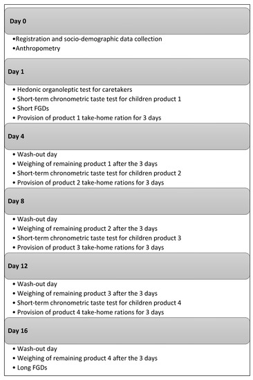 After FDG1, a chronometric taste test was performed with children with the first RUTF from the sequence random list. This chronometric taste test was conducted to assess the amount of RUTF consumed in 15 and 30 min, as a means to evaluate their acceptability among children. The child was free to eat the presented RUTF, and after 15 min (T15), the remaining amount of product was weighed to determine the amount consumed by the child. The remaining product was returned to the child to continue eating until 30 min (T30) when again the remaining product was collected and weighed. This appetite test, adapted from the UNICEF appetite test [24], is a standard test before commencing community-based treatment of SAM. We defined the quantity of RUTF eaten after 30 min to be “acceptable” if at least 50% of the initial amount was consumed [17]. The chronometric taste test was repeated on each day the caregiver and child came back to collect the next batch of RUTF during the cross-over take-home ration study, again according to the random sequence list (days 4, 8, and 12; see Figure 1 below).