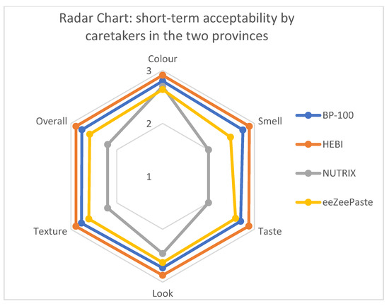 Hence, to assess short-term acceptability, each child received each RUTF product for 3 consecutive days but in different orders. Each caretaker was instructed on the use of the product first and asked to give one sachet (±100 g) to the child every day for 3 days (one sachet per day). After this period, one “wash-out” day was inserted. The process was repeated, with other wash-out days after 3 days of intake, until all children had tested the 4 products. Caregivers were provided 290–300 g of eeZeePaste, HEBI, and BP-100 for each of the 3 days and 360 g for Nutrix due to the different forms of packaging of the latter. Caregivers were asked to bring back all sachets with RUTF on the wash-out day. The total amount of eaten RUTF after 3 days was calculated from the amount of RUTF returned.