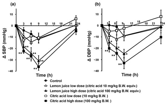 SBP (a) and DBP (b) trends in SHRs after a single oral administration of citric acid and lemon juice. Each plot represents the mean ± S.E. (n = 6); * p < 0.05, ** p < 0.01, compared with control; the indicated p values were obtained from the Dunnett’s tests. SBP: systolic blood pressure, DBP: diastolic blood pressure; SHR: spontaneous hypertensive rat, B.W.: body weight.