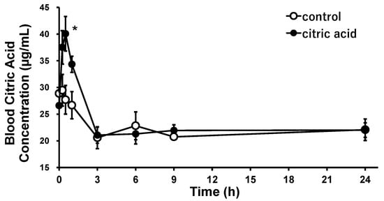 Citric acid concentration trends in the blood after a single oral administration of citric acid to the SHRs. Each plot represents the mean ± S.E. (n = 3); * p < 0.05, compared with control; the indicated p values were obtained from the Student’s t-test. SHR: spontaneous hypertensive rat.