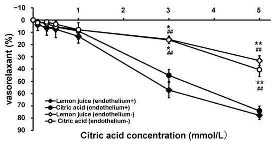 Concentration–vasorelaxation curves of thoracic aorta from SHRs after treatment with citric acid and lemon juice. Each plot represents the mean ± S.E. (n = 6); * p < 0.05, ** p < 0.01 vs. treatment with citric acid in the endothelium-intact aorta, ## p < 0.01 vs. treatment with lemon juice in the endothelium-intact aorta; the indicated p values were obtained from the Tukey-Kramer tests; SHR: spontaneous hypertensive rat.