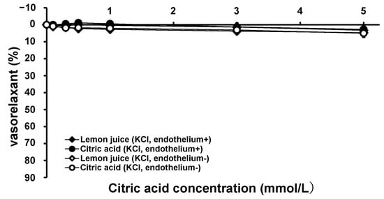 The pH of the Krebs solution in the aortic assay system aerated with a mixture of 95% O2 and 5% CO2 gas was 7.43. The pH change in the aortic assay system caused by the addition of citric acid and lemon juice may cause a vascular response owing to the changes in intracellular and extracellular conditions []. Therefore, to verify the pH-dependent vascular response after citric acid and lemon juice treatments, the vasorelaxant effects of lemon juice, citric acid, and hydrochloric acid were measured at the same pH. These results are summarized in Table 2. The pH in the chambers with citric acid and lemon juice at a citric acid concentration of 5.00 mmol/L were 6.08 and 6.53, respectively, and the corresponding chamber HCl concentrations for the same pH were 8.43 × 10−4 mmol/L and 3.01 × 10−4 mmol/L, respectively. As shown in Figure 3, at an intra-chamber citric acid concentration of 5.0 mmol/L, 74.1% and 77.7% vasorelaxation was caused by adding citric acid and lemon juice, respectively. In contrast, HCl at the same pH induced no vasorelaxation but vasoconstriction.