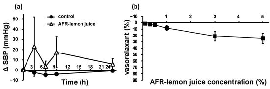 SBP trends (a) in SHRs after a single oral administration of AFR-lemon juice or pure water as control (control: n = 6, AFR-lemon juice: n = 4), and concentration–vasorelaxation curves (b) of endothelium-intact thoracic aorta from SHRs after treatment with AFR-lemon juice (n = 3). “AFR-lemon juice concentration (%)” in (b) mean the citric acid concentration when adding the same amount of lemon juice as the added AFR-lemon juice. Each plot represents the mean ± S.E.; AFR: acid-flavonoid-reduced; SBP: systolic blood pressure; SHR: spontaneous hypertensive rat.